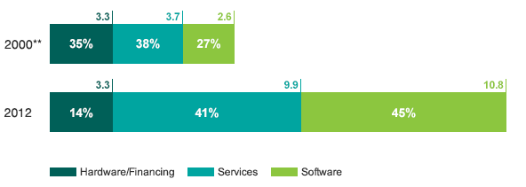 Last quarter, IBM had a service backlog of $141 billion, up 6% year-over-year. The company is constantly shifting out of low-margin businesses to focus on high-margin opportunities, and it has become very good at maximizing and growing profits. The IBM of today looks very different from the IBM of 2000, as can be seen from the graphic below.