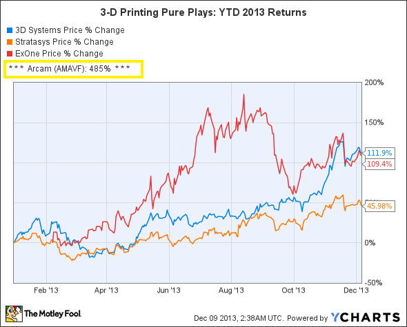 With a little help from a year-end Santa Claus rally, the four pure-play additive manufacturing -- better known as 3-D printing -- companies could wrap up 2013 with a 200% average return. 3D Systems (DDD +2.04%), Stratasys (SSYS +2.12%), ExOne (XONE +0.00%), and Arcam (NASDAQOTH: AMAVF) are currently up an average of 188% for the year. Let's look at which company is powering the group, which is holding it back, and the three key events that investors should monitor in 2014.