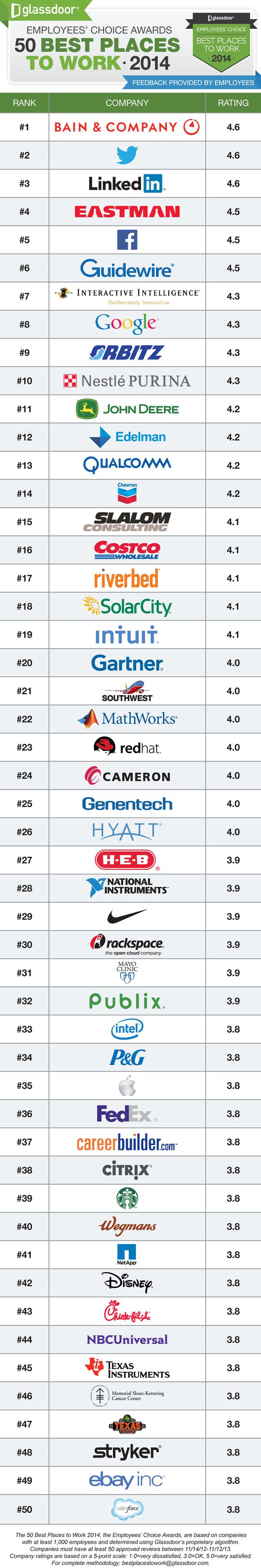 Glassdoor's Top 50 (and the 50 Best Medium-Size Companies to Work For) is based wholly on anonymous, validated reviews of enterprises with 1,000 or more employees. Reviews come from current and past employees who rate employers on a scale of 1 to 5 in areas from pay to whether they would recommend the business to a job-seeking friend. Results are tallied from a total of 500,000 reviews submitted over the past year.