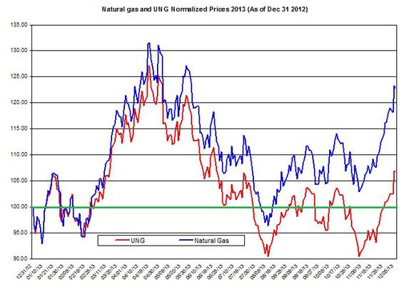 The chart below shows the movement of the U.S. Natural Gas Fund and the price of natural gas normalized to the end of last year.