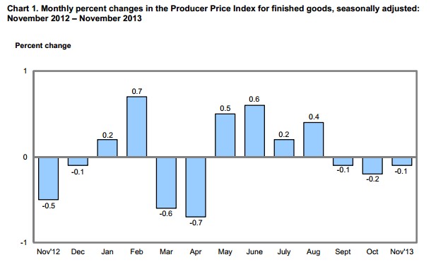 The Producer Price Index for finished goods fell a seasonally adjusted 0.1% for November, according to a Labor Department report (link opens as PDF) released today.