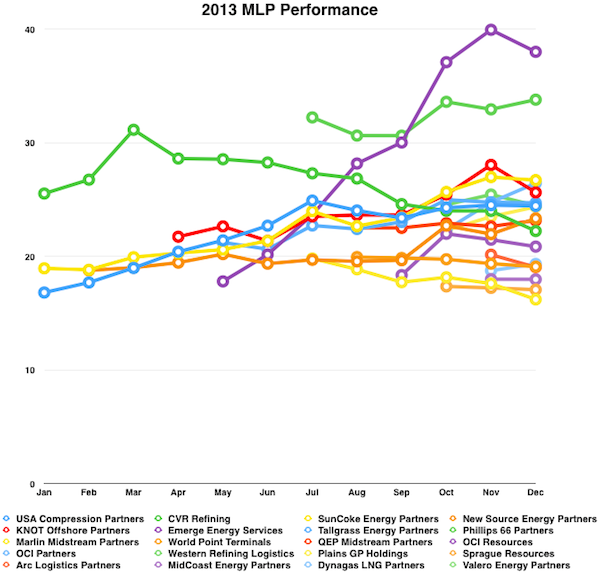 Twenty different MLPs in one chart can only tell you so much, but there are important takeaways here. First and foremost, Emerge Energy Services is far and away the best-performing MLP in the class of 2013. Emerge produces frack sand and processes and distributes transportation fuels. At the time of this writing, it's up just shy of 130% on the year.