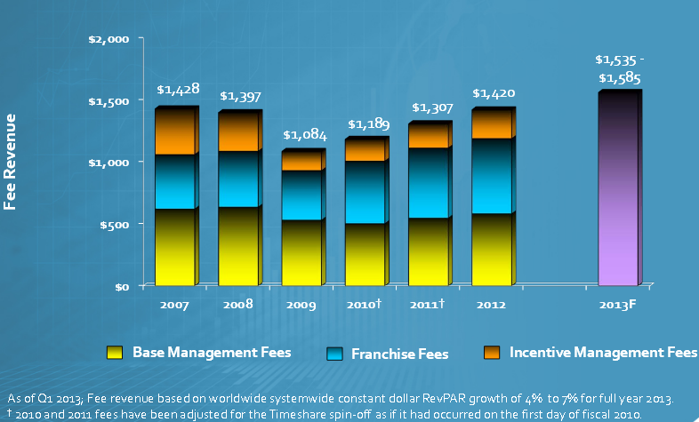 Just like restaurants, Marriott's owners and franchisees take on most of the risk as well as responsibilities and still generate revenue for the company. Chief executive Sorenson said in the 2012 shareholder letter, "By focusing on managing and franchising hotels, rather than owning them, we drive strong shareholder value and high return on invested capital." The company expects 8%-12% growth in revenue fees in 2013.