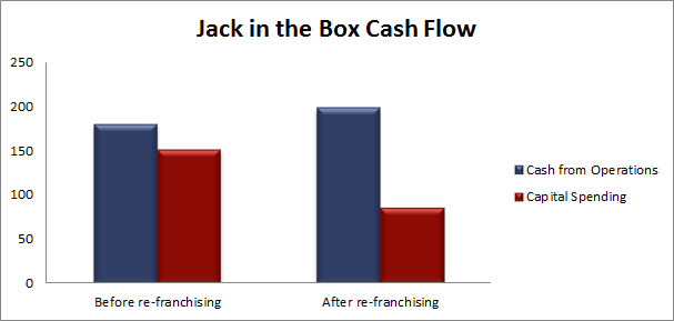 Just five years ago, 62% of Jack in the Box's 2,158 restaurants were company-owned and operated. The company was spending more than $150 million per year to maintain its Jack in the Box and Qdoba locations, which generated about $180 million in cash flow from operations.
