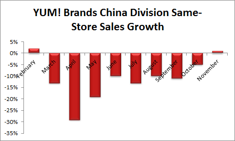 Yum!'s KFC concept in China struggled mightily in 2013 due to numerous publicity issues, including contaminated chicken and a bird flu outbreak in the nation. Same-store sales in China declined 30% in April at the height of the bird flu scare.