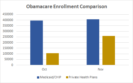 Compared with private health plan enrollment, Medicaid certainly appeared to be a big winner. The number of individuals determined to be eligible for Medicaid or the Children's Health Insurance Program, or CHIP, far exceeded the number of people selecting private health plans in October. While the figures weren't as lopsided in November, Medicaid/CHIP enrollment still came in well above the private health plan numbers.