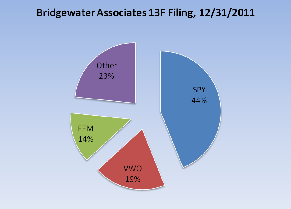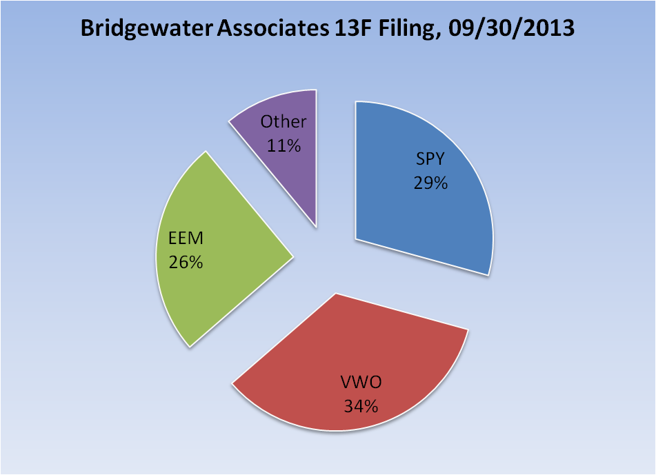 Bridgewater Associates, the hedge fund founded by Ray Dalio, has a fascinating composition. It mixes concentrated investments in macroeconomic categories (usually through large, liquid ETFs) with a plethora of smaller positions. The fund's equity holdings disclosed on Sept. 30, 2013, stood at $11.8 billion. Three holdings made up 89% of the fund: the SPDR S&P 500 ETF (SPY +0.25%), the Vanguard FTSE Emerging Markets ETF (VWO +0.46%), and the iShares MSCI Emerging Markets ETF (EEM +0.73%).