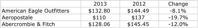 Using the table above, we can see the sales per square foot at each of these three retailers. Interestingly, American Eagle's sales per square foot stand higher than those of Aeropostale or Abercrombie & Fitch. If this weren't attractive enough, then the change in their metrics over the past year should impress you. From 2012's third quarter to this years' quarter, American Eagle's sales fell 8.1%. Although this isn't something to brag about, investors can take solace in knowing that its results outperformed the 12% drop experienced by Abercrombie & Fitch and the tremendous 19.7% drop reported by Aeropostale.