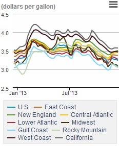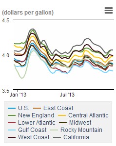 At these latest prices, the West Coast pays the prettiest penny for both gasoline ($3.472) and diesel ($3.982). On the other end, the Gulf Coast can guzzle gas for just $3.047 and diesel for $3.766 per gallon.