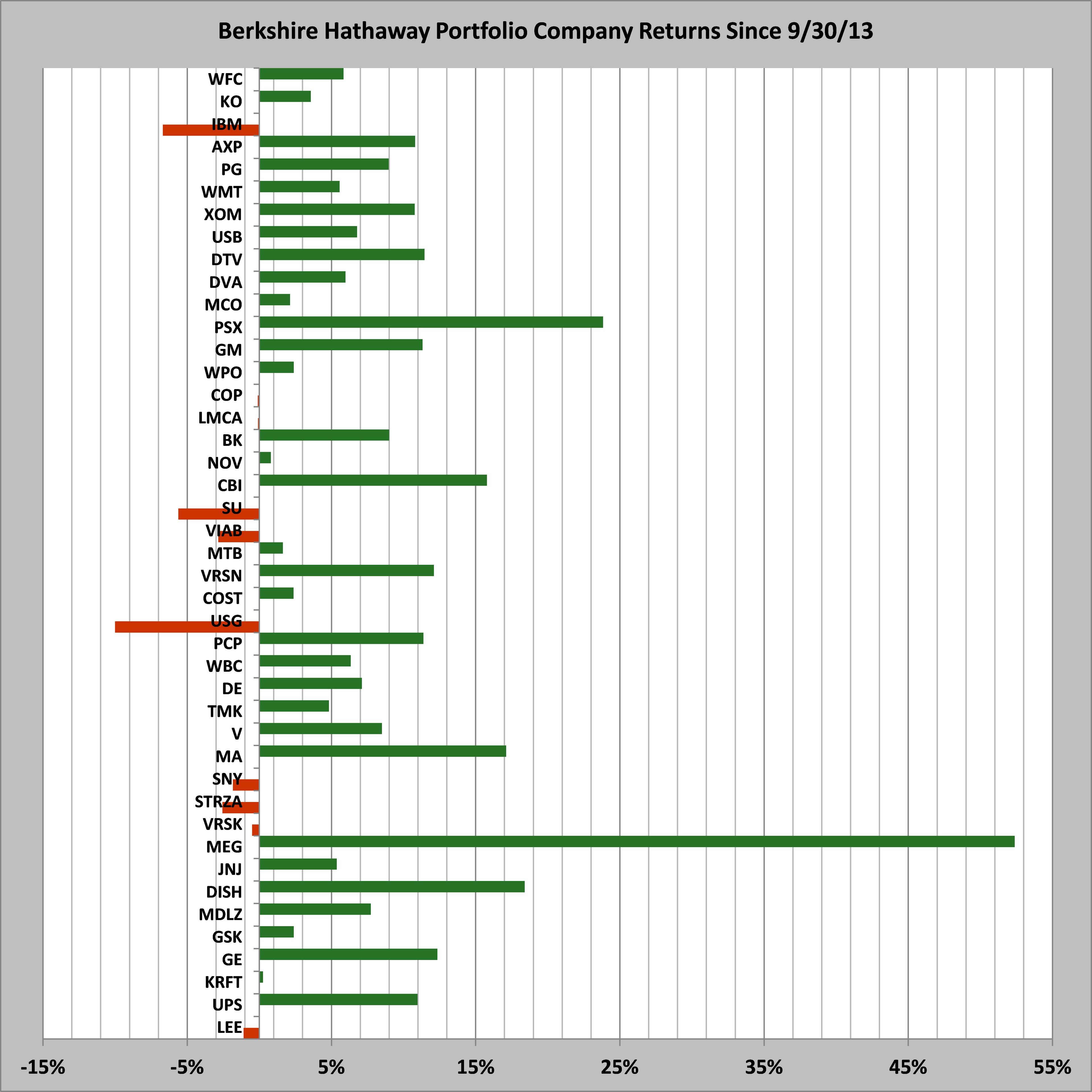 As a matter of fact, of the 43 companies in the Berkshire Hathaway portfolio, more than 13 have had returns of 10% or more since September. The biggest winner, Media General (NYSE: MEG), has seen its stock rise by more than 50%, and it's up more than 400% on year.