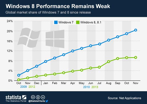It's a fact that Windows 8 is being adopted at a slower rate than Windows 7, but Windows 7 benefited from the failure of Vista and an eight-year gap between Windows XP and itself. Windows 8 has no such advantages. Ultimately, what matters is not which version of Windows is being adopted, but that Windows is being adopted in the first place. Tablets have pressured Windows on the consumer side, but on the enterprise side, Windows is still king.