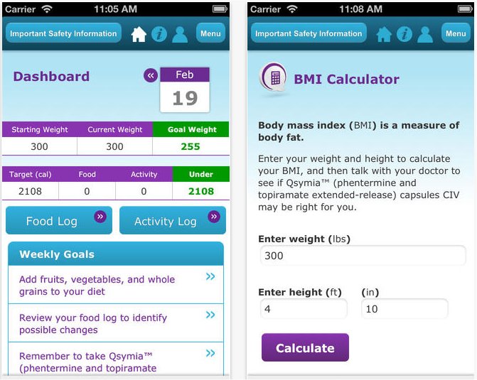 Although Q and Me is available to anyone, not just patients taking Qsymia, the app promotes its own drug in a way that could be considered unethical, as seen on the right side of the following screenshot.