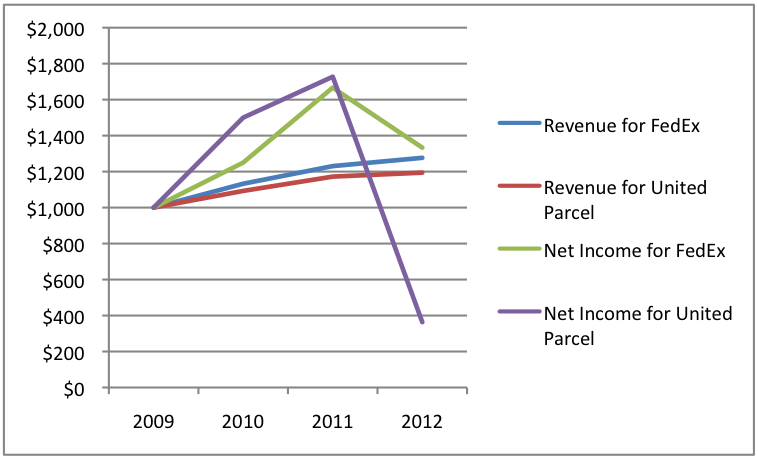 As a note of caution, due to the difference in annual reporting periods between the two entities, FedEx's annual data is for fiscal years 2010 through 2013. Furthermore, both revenue and net income are assigned using a base of $1,000 so that we can better compare the growth rate of both revenue and net income over time by measuring the difference in change.