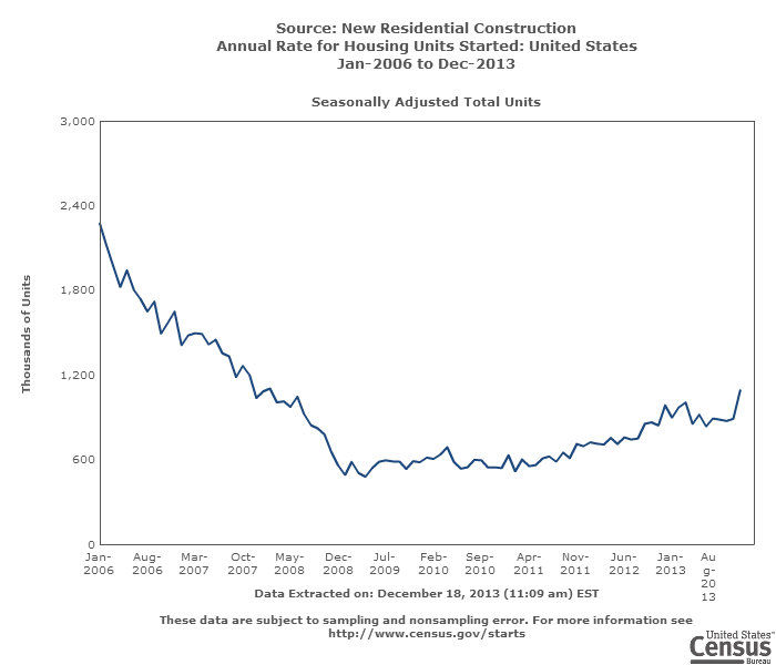 The U.S. government is still catching up with economic reports following its shutdown, and today's housing starts report paints a positive picture of the last couple of months. After rising 1.8% in October, housing starts jumped up a whopping 22.7% for November to a seasonally adjusted annual rate of 1,091,000, according to a Commerce Department report (link opens a PDF) released today. Analysts were pleasantly surprised by the news, as they expected November's gain to clock in at a more modest rate of 952,000.