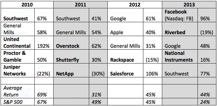I think there's an even better way to show that these companies have something special driving them forward. I went back over all five years and compared the returns of each company with those of its closest competitor. In some cases, a comparable competitor didn't exist, as is the case for Shutterfly or Facebook. Those companies were thrown out.