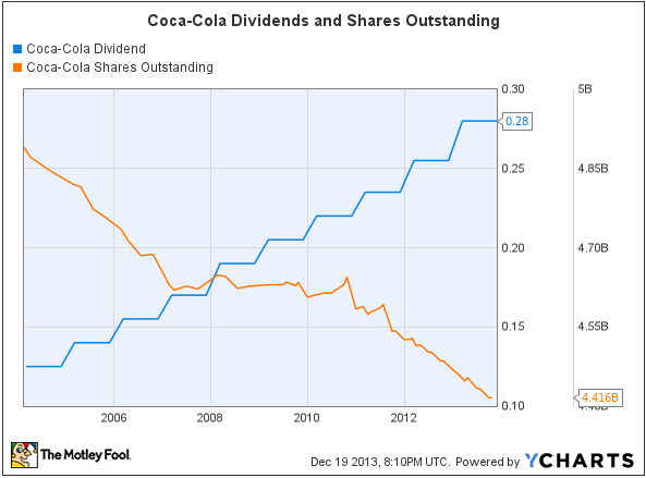 The company has a long-standing share buyback policy, which has consistently reduced its share count through the years. As of the third quarter of 2013, Coca-Cola had spent $2.8 billion in stock buybacks during the first nine months of the year, and the company is planning to end 2013 with a repurchase of between $3.0 billion and $3.5 billion for the full year.