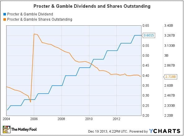 The company made a big share issuance to finance the acquisition of Gillette back in 2005, but it has been steadily reducing its share count since then. During the third quarter of 2013 P&G repurchased $2.5 billion in stock and returned $1.7 billion in cash to shareholders via dividends.