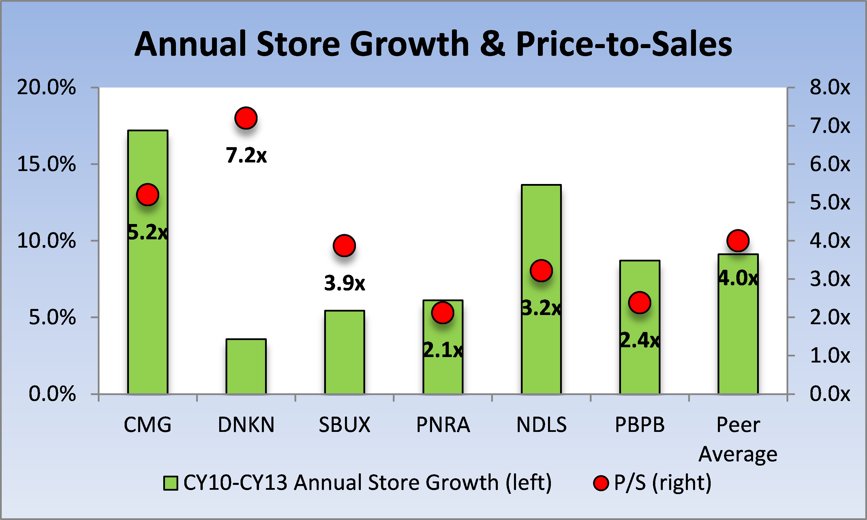 Fast-casual and fast-food restaurants, while different in their menu offerings, are ultimately very similar when it comes to valuation. Store expansion and store-level operating profitability, in addition to same store sales, primarily determine what valuation the market places on shares. Potbelly's is besting or in line with its competitors for store expansion and store-level operating margins, although the company is recently underperforming on a same store sales basis.