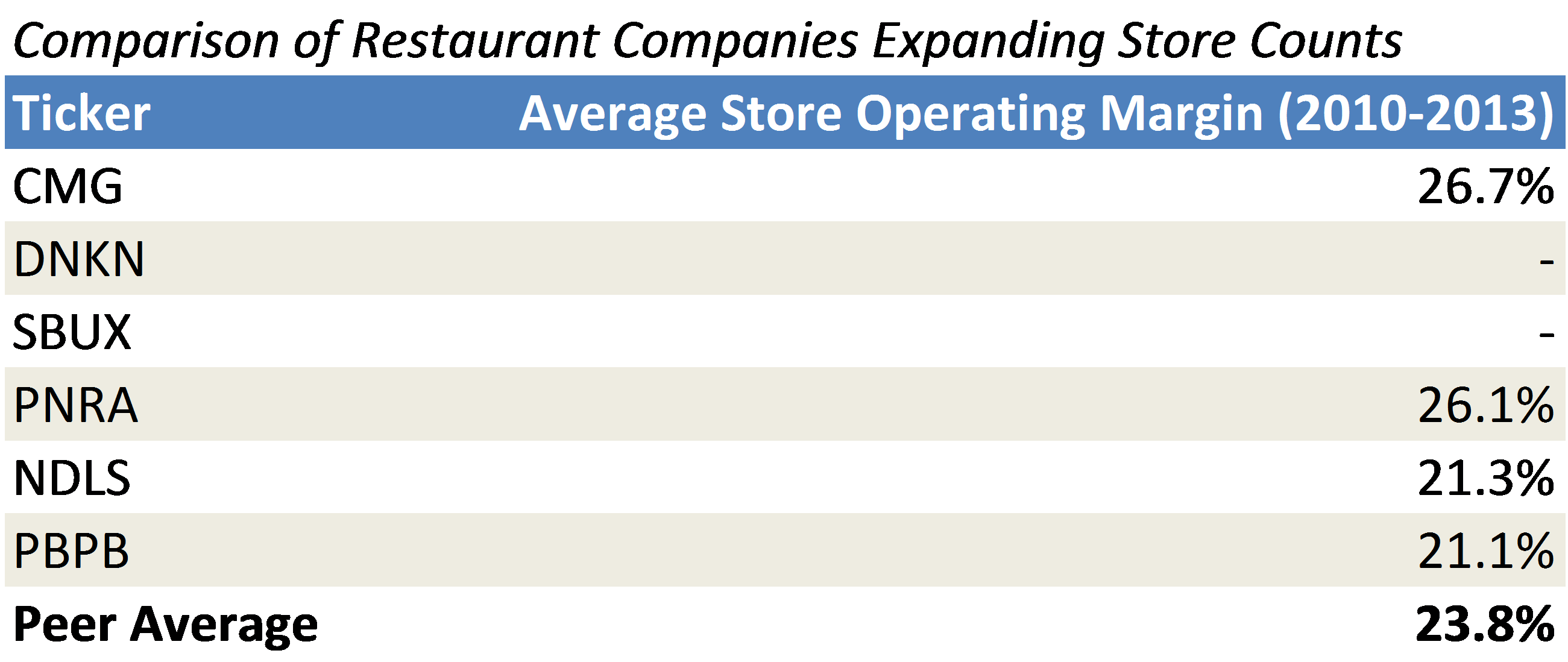 The company currently has 280 stores in 18 states and is growing its store count at an annualized rate of 8.7%. In its S1 filing, management commented on plans to ramp up store expansion to 10% annually. Comparing other chains in such expansionary phases, Potbelly is matching the industry which has averaged 9.1% annually. Dunkin Brands, Panera and Starbucks are expanding slower and store counts have increased annually by 3.6%, 6.1% and 5.4%, respectively, since 2010. Only Noodles & Company and Chipotle Mexican Grill are outpacing peers at 13.7% and 17.2%, respectively.