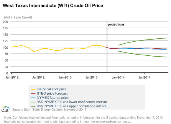 Just because that is consensus, however, doesn't mean investors should expect steady oil prices in 2014. As part of the EIA's forecast, it also estimates that the potential exists for oil prices to trade for anywhere between $66 per barrel on the low end and $115 on the high end, as the following chart indicates.
