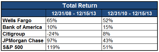 While both of those are still dramatically trailing the S&P 500 total return (up almost 120% over that same time period), the reality is that if you narrow that time frame to from December of 2010 until today, the total return of Wells Fargo stands at 52%, the S&P at 51% and Bank of America at 15%.