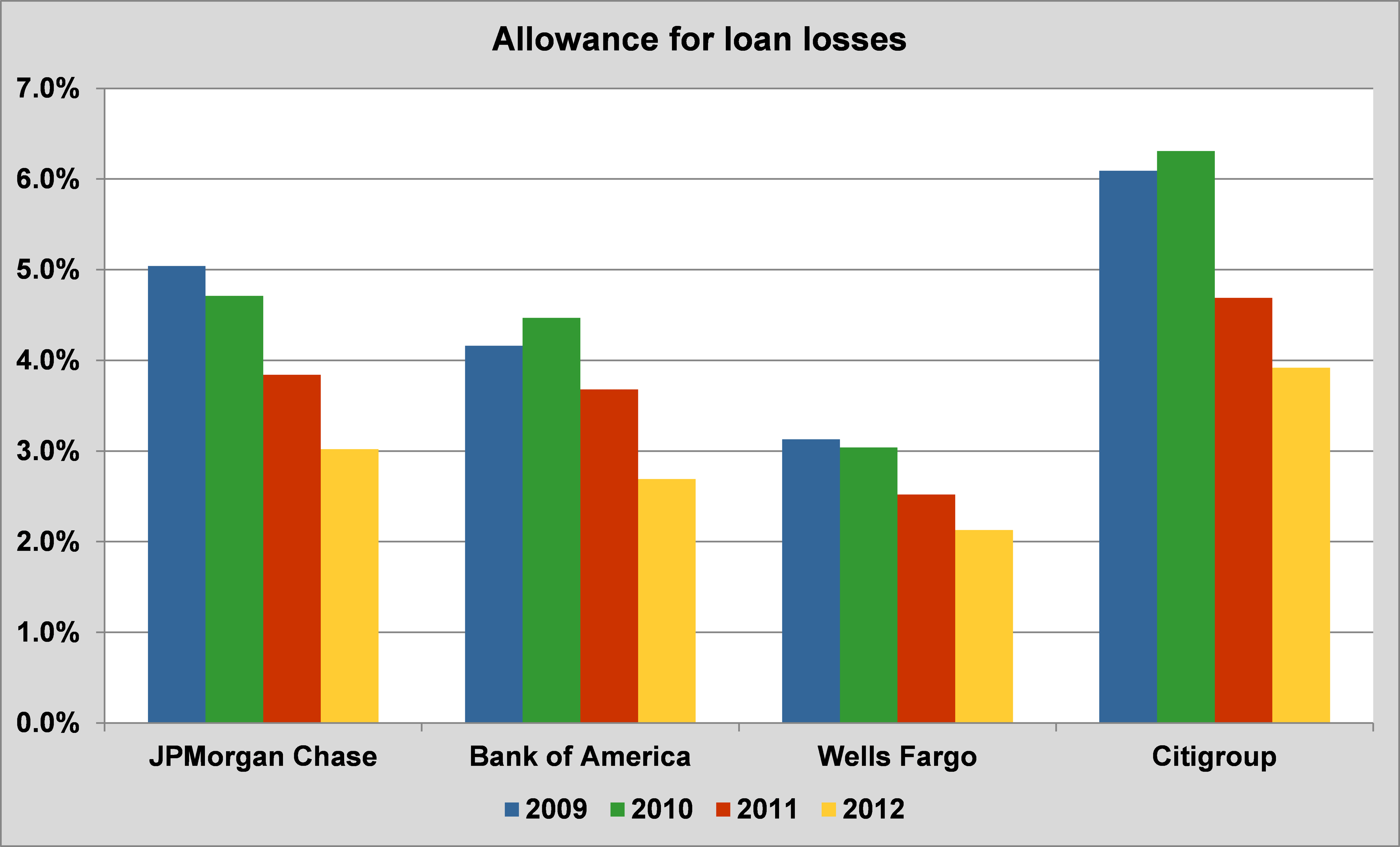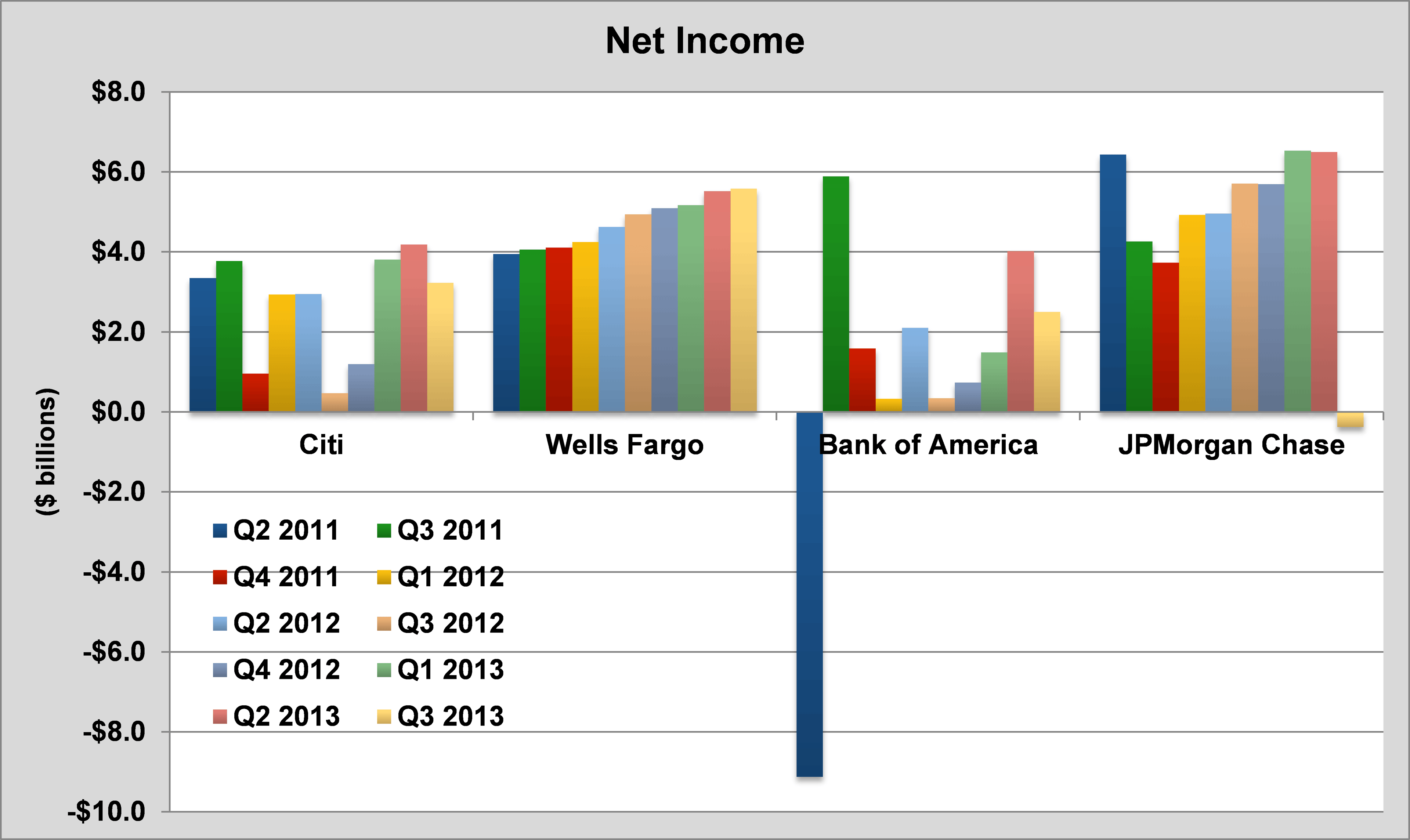 JPMorgan Chase has had the largest single settlement value and the London Whale fiasco, Citigroup has had monumental losses, and its stock is still dramatically down relative to its pre-crisis levels, and Bank of America has well, been Bank of America.