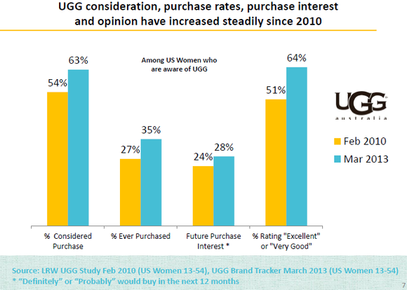 Despite Street sentiment that UGGs are a fad, a company survey shows more women than ever are aware of -- and are considering buying -- them. But wait, there's more. The company has expanded into fashion boots (leather and not sheepskin) challenging rivals such as Steven Madden, and is aggressively courting men. Deckers opened its first men's store in 2012 and eventually expects men's footwear to contribute 20% of total revenues.