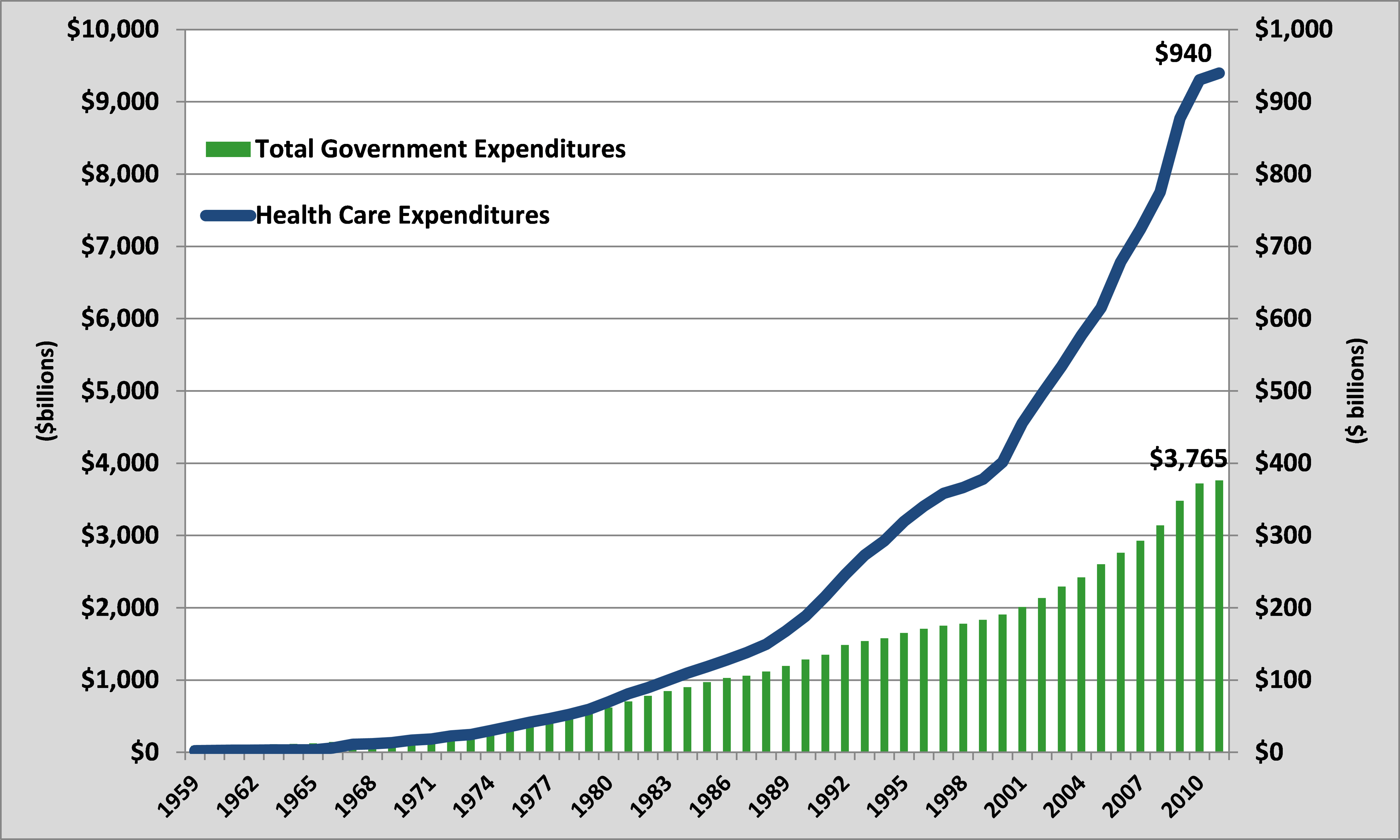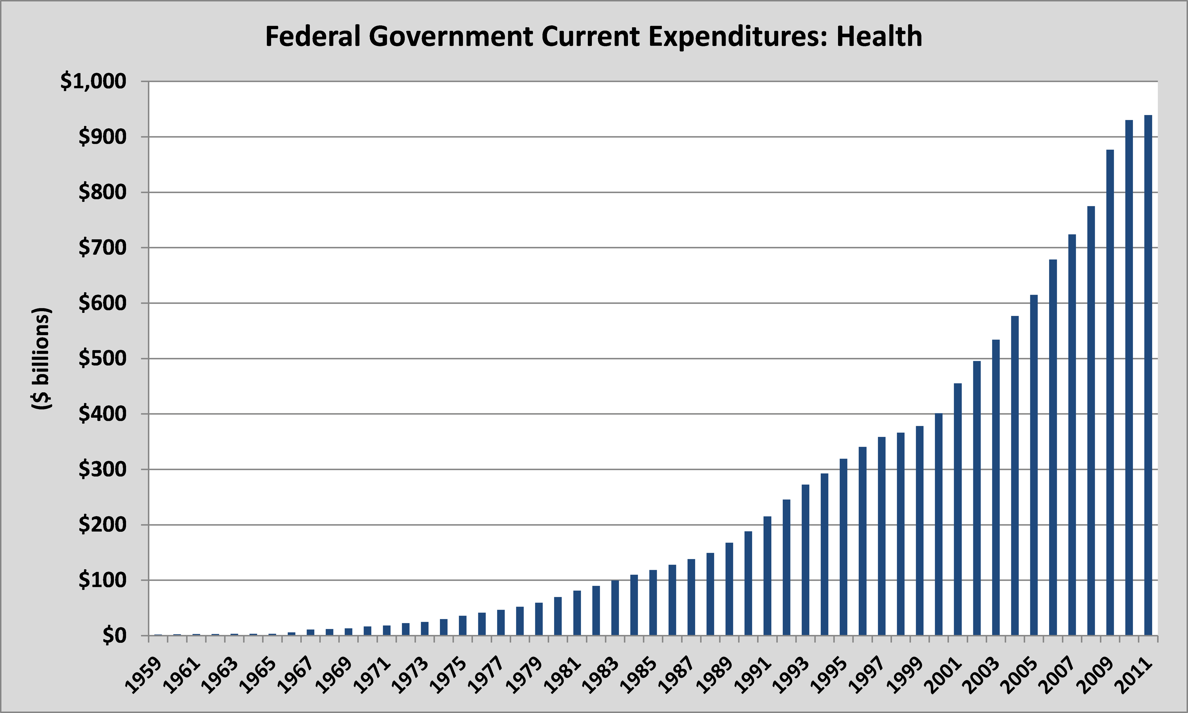 There is no denying that the cost of health care in the U.S. has been traveling on an unsustainable path for the better part of the last 50 years. Consider the U.S. government's spending on health care as shown in the chart below: