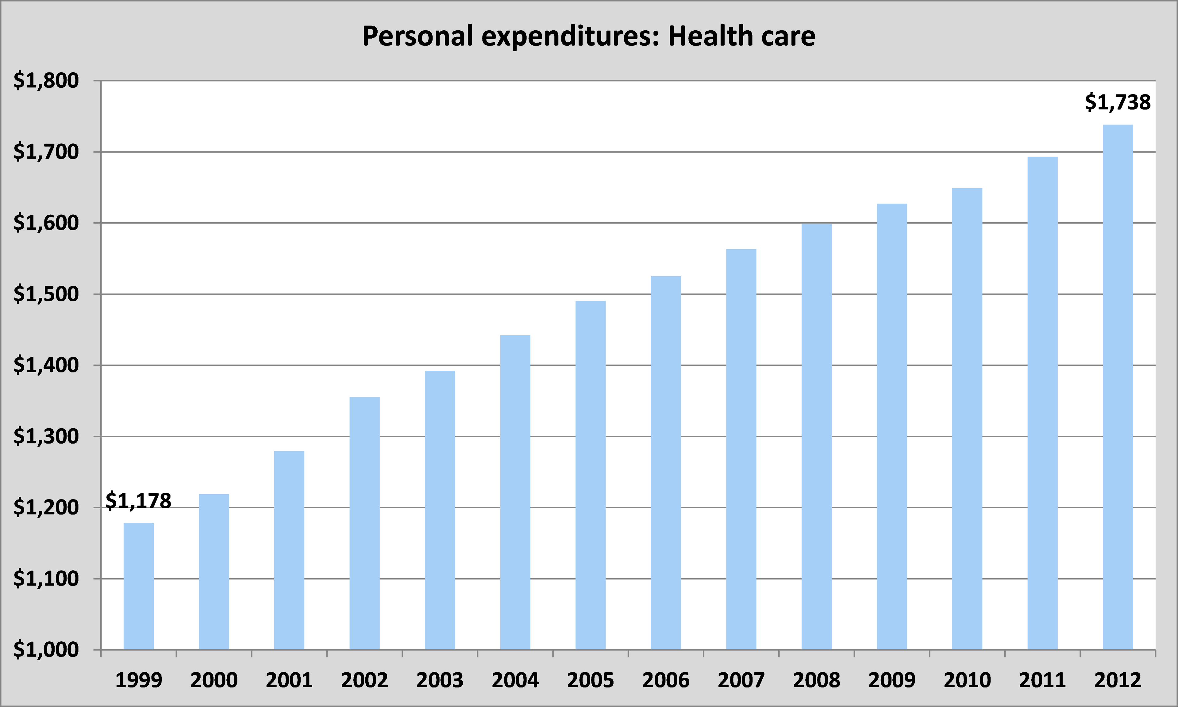 Consider that the personal spending on health care has risen from $1.2 trillion in 1999 all the way to $1.7 trillion in 2012, an increase of 50%. This is all while all other expenditures (excluding health care) have only grown by 33%:
