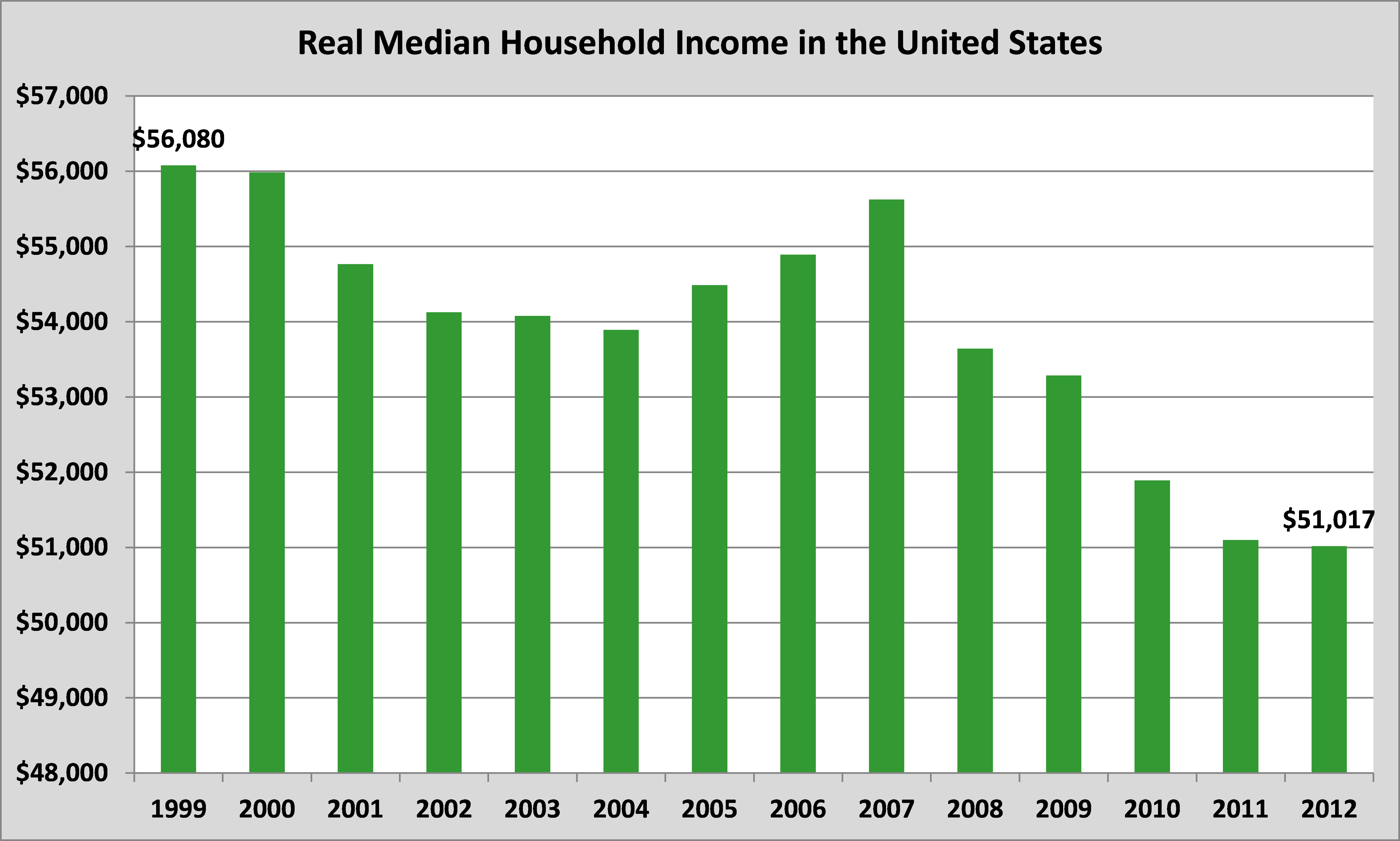 Yet it isn't as though the average American can easily keep up with this unsustainable growth in health care spending, as the median household income in the U.S. has actually fallen by almost 10% over the same time period: