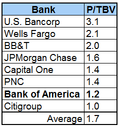 Yet even despite this incredible run, the bank still remains radically less expensive when comparing its price to tangible book value -- which is the actual value available to shareholders -- relative to its fellow banking peers: