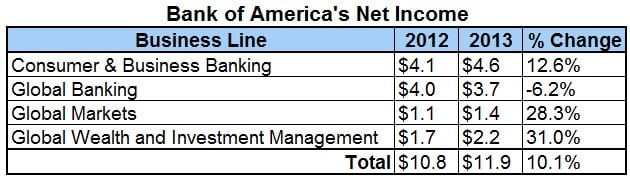 Of course, simple relative value alone doesn't warrant an investment decision, but Bank of America has excelled in growing its businesses as well. The four core business lines at Bank of America have seen their net income rise by more than 10% in total when comparing the first nine months of 2012 to 2013: