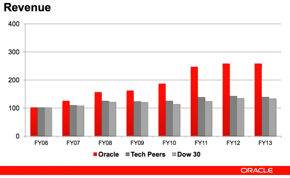 On the infrastructure front, the company plans to be price competitive against Amazon.com and Microsoft Azure, and at the same time focus on differentiation, which should improve margins in the long run. The company already has a competitive pay-as-you-go monthly pricing model in motion, and has successfully developed some star products, like the Oracle SuperCluster T5-8, a system designed for database and enterprise applications based on the world's fastest database server, and the world's fastest processor, delivering a 10x better price/performance than a comparable IBM solution.