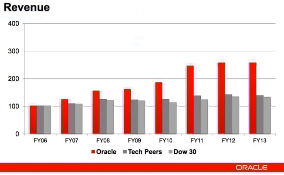 However, as competition from cloud players such as Salesforce.com (CRM +0.13%) and Workday (WDAY +0.61%) increases, Oracle could find it very challenging to continue growing its top line. Revenue between 2012 and 2013 barely increased.To boost sales, a reorganization of the U.S. sales force may be on its way, according to JMP Securities analyst Pat Walravens. Will this change be enough for Oracle to improve top line? More important, what other choices does Oracle have in order to return to a high-growth path?