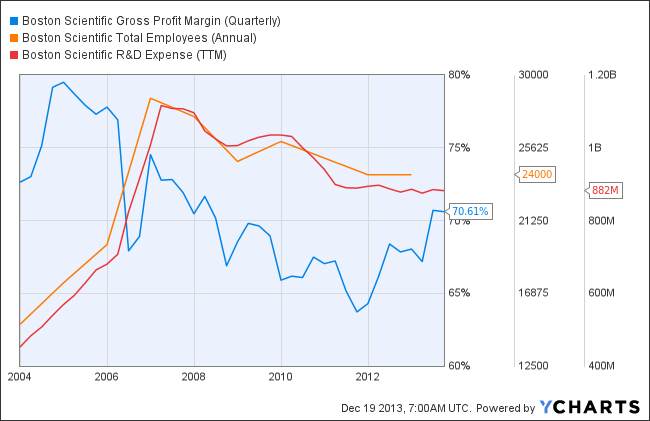 The expectations of the market aren't unfounded. Boston Scientific has made some impressive progress on this front. Gross margins have risen to a level not seen since 2008. In an effort to further control costs, the company has also been steadily reducing not just its employee numbers but R&D spending as well.