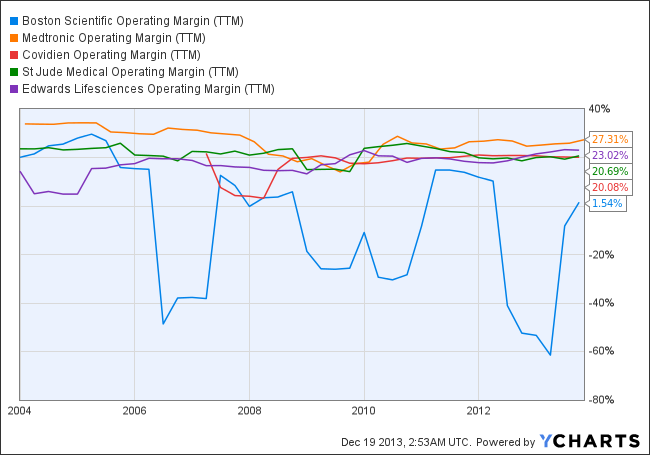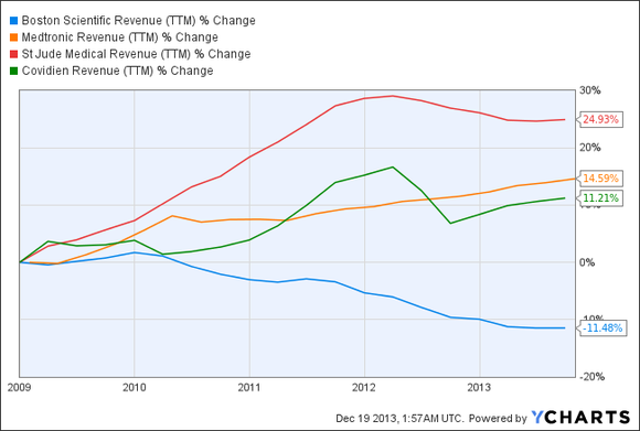 The cardiovascular segment remains the company's largest, but sales during the third quarter of 2013 were a paltry $667 million; that would be $2.67 billion on an annualized basis. In 2007, that figure was $6.56 billion. That is a slight improvement over 2012's dismal performance, however, when the company's share price nearly fell through the $5 dollar range.