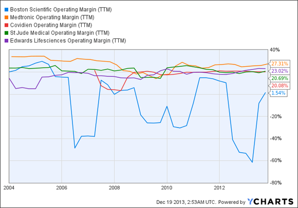 According to analyst surveys compiled by the Evaluate Group, the global medtech industry is expected to outpace pharmaceuticals over the next five years with a CAGR of about 4.5%. The same survey suggests that Boston Scientific will grow at a rate of about 2%, although the market seems far more optimistic. The company's recent price suggests its topline growth will outpace the industry as a whole, but that's not all. It appears that the market is also assuming its operating margin, which has been underwater for most of the past five years, will outshine its peers.