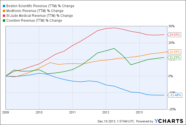 The past couple of years have been tough on medtech companies. Few of the industry leaders that derive their revenue solely from medtech sales have had a rougher time than Boston Scientific Corporation (BSX +0.91%). While industry stalwart Medtronic, Inc. (MDT +0.12%) has posted steady gains, Boston Scientific has been losing ground over the past 5 years.