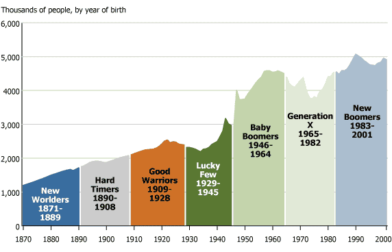 The combination of declining fertility and lengthening lifespans produces a different sort of problem, though it may not be as intractable as you think. The Baby Boom generation was massive, much larger in size than its parents' generation, and that influx of workers provided social-insurance programs with very favorable ratios of workers to retirees. The Millennials (or "New Boomers" according to the chart below) -- who will be parents to the generation whose lives we've thus far followed through this fast-changing future -- are not a much larger generational cohort than their parents, and a number of factors, from weaker economic prospects to changing social attitudes, indicate that they may not wind up having enough children to sustain population equilibrium.