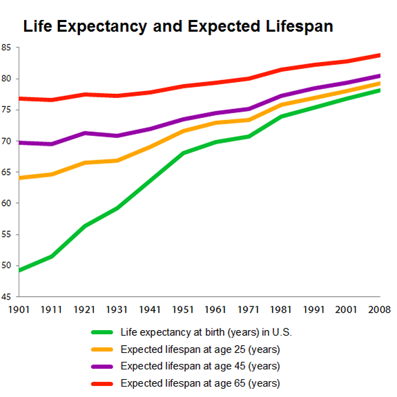 Over the past 110 years, life expectancy from birth has increased by nearly 60%, but a healthy 25-year-old might only expect to live 25% longer than they did at the turn of the 20th century. Someone who made it all the way to 65 today could expect to live perhaps 10% longer than their great-grandparents did a century ago. If we could only make similar improvements to the expected lifespan of today's 65-year-olds as have been made for the life expectancies of newborn children since 1900, the average 65-year-old today could live to be 135! And that's a very conservative goal for ambitious scientists like Aubrey de Grey and others at SENS.