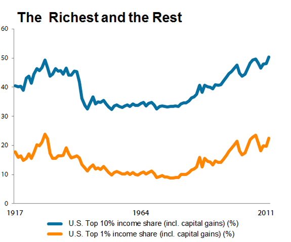 The most recent recession was, by nearly every measure, much weaker than the Great Depression, because policymakers have built up a lifetime's worth of tools and knowledge since that era to prevent another economic dislocation of similar magnitude. This expanded toolset prevented millions from suffering as their forbears suffered in the 1930s, but it's also had the effect of blunting any widespread rage for change -- the rapid elimination of the Occupy movement from city streets would have been far less easily accomplished if its protesters truly had nowhere else to go and no other possible means of support. But that doesn't mean that inequality isn't real and that it isn't going to be a big problem for society without any structural changes. In fact, the top 10% of American earners are now taking home more of the total income pie than they were just before the Great Depression -- the top 1% is only a hair away from surpassing its Roaring 20s highs as well: