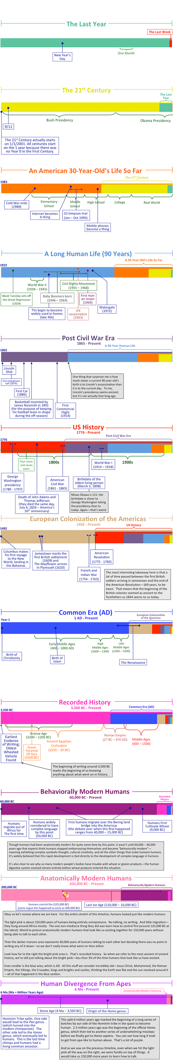 On this timeline, you wouldn't even be able to see the development of the earliest modern computer. ENIAC wouldn't show up until midway through the light blue bar that marks the beginning a 90-year-old life. That bar shrinks to a sliver on the span of recorded history, and disappears completely on the bar marking the existence of modern humans.