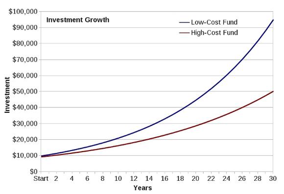 In other words, over a 30-year period, mutual-fund fees have eaten up nearly half of the high-cost investor's returns.