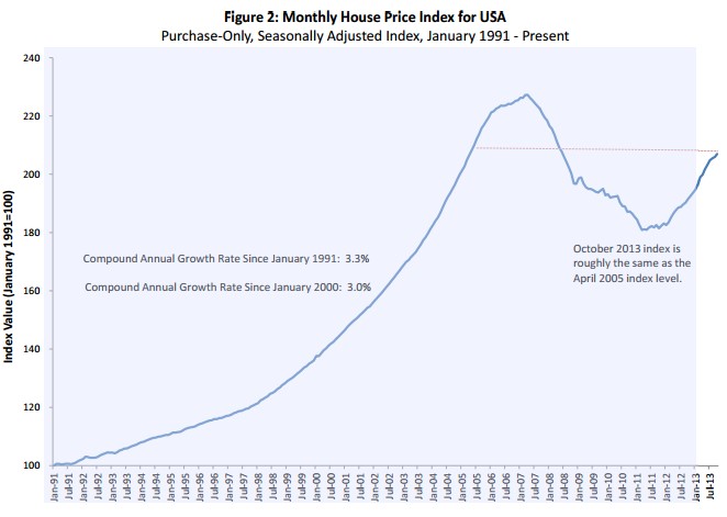 The FHFA House Price Index is calculated using single-family-home sales-price information from mortgages sold to or guaranteed by Fannie Mae and Freddie Mac and, at current levels, is comparable to readings from April 2005.