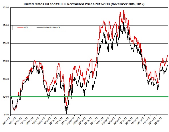 The chart below presents the movement of this ETF and the price of oil normalized to the end of November 2012.