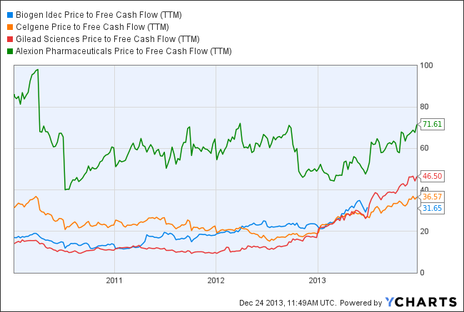 In case you're wondering why Biogen Idec's blue line just disappears, its FCF went negative during Q2 2013. During that period Biogen Idec repurchased all rights to Tysabri from Elan for $3.25 billion. As an investor, negative FCF is definitely a warning, unless the company just used a heap of cash to make a smart investment.