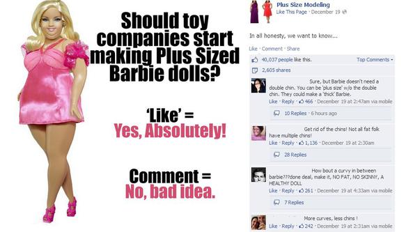 At the time of this writing, the post, which comes with an artist's conception of a plus-size Barbie, has attracted over 40,000 "Likes" -- the equivalent of a "Yes" vote for the plus-size Barbie. Meanwhile, there were over 4,700 comments -- an equivalent of a "No" vote.