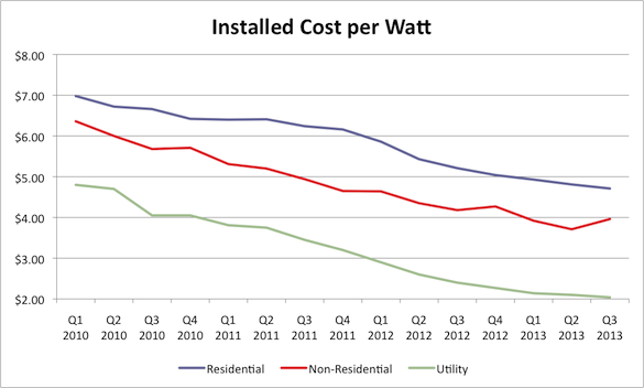GTM Research and the Solar Energy Industries Association published a report each quarter, and residential costs were down 9.7% over the past year, commercial costs are down 6.1%, and utility costs are down 15%.