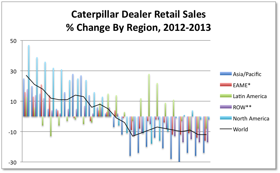 Every region in Caterpillar's book reported falling sales for two consecutive months. Despite increases in global mining activity, the industry remains depressed. U.S. coal consumption is expected to rise 4.4% this year, but low prices for coal itself haven't been able to offset the competitively low price seen in natural gas. As a result, the Energy Information Administration says that through October, domestic coal production has fallen nearly 2%. Moreover, as Europe remains mired in economic malaise and international markets, particularly China, produce more of their own supplies, exports are down more than 8%. Overall, global coal demand will grow at an average rate of just 2.3% per year through 2018, but that's not likely to help many miners advance.