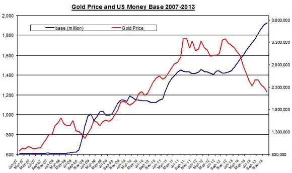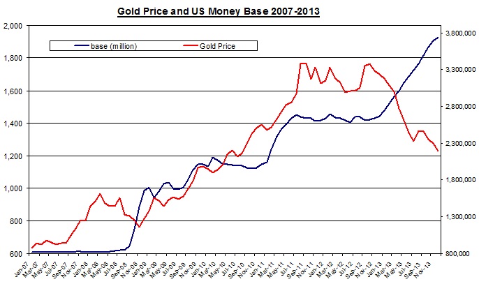 The recent decision by the FOMC to start tapering its asset-purchase program might have reduced the price of gold. But this mini-taper isn't likely to have a strong effect on the prices of precious metals. The chart below shows the developments in the price of gold and the U.S. money base in the past several years.